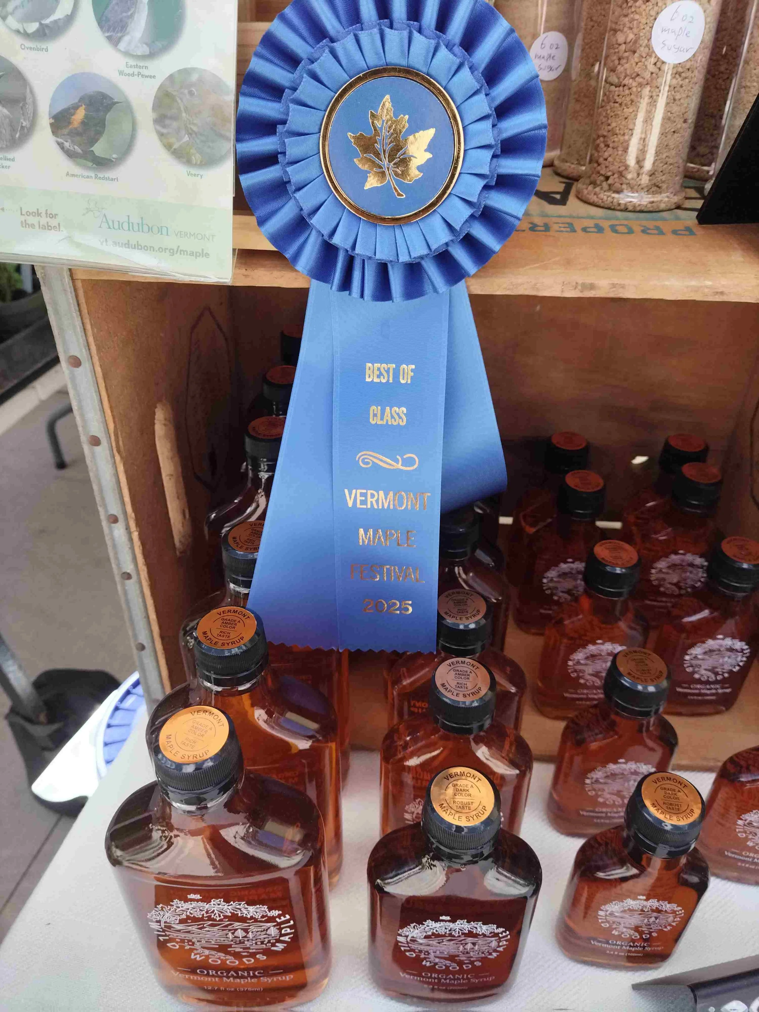 This glass bottle is filled with a liter of our organic maple syrup. After talking to thousands of customers this summer at various farmer’s markets, we realized there was a demand for our syrup packaged in glass rather than plastic. The syrup is produced by our family at our sugar house in Walden, VT. Our land has been recognized as bird friendly by Audubon Vermont.